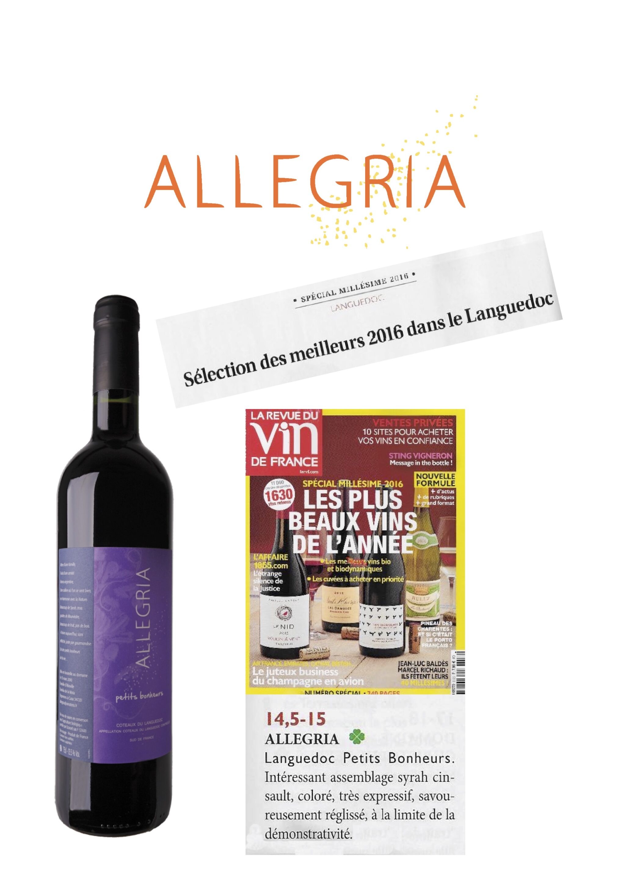 La revue du Vin de France de Mai 2017 a sélectionné l’ Allegria Petits bonheurs 2016 parmi les meilleurs 2016 dans le Languedoc.
