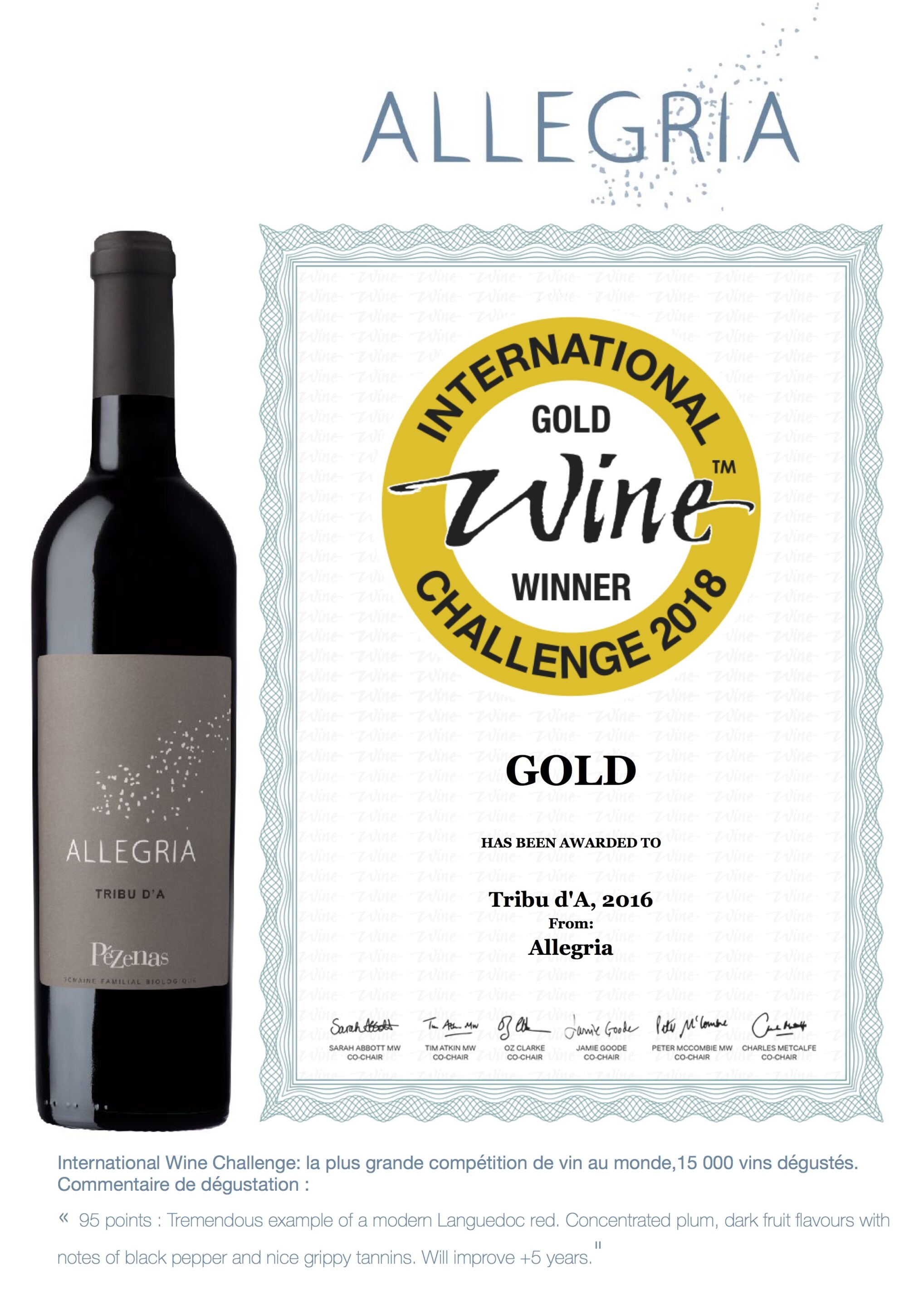 Nous sommes très fiers de notre nouveau tribu d’A 2016 qui a gagné la médaille d’or à l’International Wine Challenge, avec 95 points.